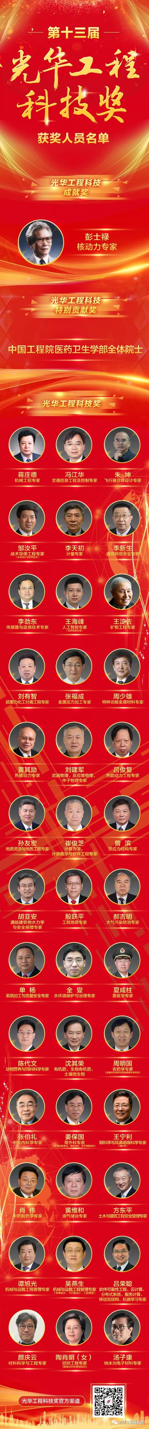 11月8日,第十三屆光華工程科技獎(jiǎng)揭曉儀式在北京隆重舉行。中國兵器工業(yè)集團(tuán)有限公司科技委副主任委員、戰(zhàn)術(shù)導(dǎo)彈工程專家鄒汝平獲第十三屆光華工程科技獎(jiǎng)(獲獎(jiǎng)人員全名單及鄒汝平事跡附后)。 光華工程科技獎(jiǎng)由中國工程院主管,每兩年頒發(fā)一次,目前已是第十三屆,被譽(yù)為“中國工程界最高獎(jiǎng)項(xiàng)”,極大地激勵(lì)了我國工程師、科學(xué)家從事工程科技研究、發(fā)展、應(yīng)用的積極性和創(chuàng)造性。根據(jù)光華工程科技獎(jiǎng)候選人提名要求,候選人需在重大工程設(shè)計(jì)、研制、建造、生產(chǎn)、運(yùn)行、管理等方面解決關(guān)鍵科學(xué)技術(shù)問題或在工程科學(xué)技術(shù)及工程管理領(lǐng)域有重要發(fā)現(xiàn)、發(fā)明,并有顯著應(yīng)用成效,或者是應(yīng)用本人研究成果、發(fā)明創(chuàng)造,發(fā)展高新技術(shù)及相關(guān)產(chǎn)業(yè),成效特別顯著者才可提名。今年,全國范圍內(nèi)共產(chǎn)生了296名有效候選人。 此次揭曉儀式正式公布了從296名候選人中評選出的第十三屆光華工程科技成就獎(jiǎng)、光華工程科技特別貢獻(xiàn)獎(jiǎng)以及光華工程科技獎(jiǎng)的獲得者,最終僅有40位專家和1個(gè)團(tuán)體獲獎(jiǎng)。本屆光華工程科技獎(jiǎng)的獲獎(jiǎng)科學(xué)家們,緊密圍繞國家重大戰(zhàn)略需求,瞄準(zhǔn)經(jīng)濟(jì)建設(shè)和事關(guān)國家安全的重大工程科技問題,緊貼新時(shí)代社會民生現(xiàn)實(shí)需求和軍民融合需求,加快自主創(chuàng)新成果轉(zhuǎn)化應(yīng)用,為創(chuàng)新驅(qū)動(dòng)發(fā)展,建設(shè)科技強(qiáng)國,以及實(shí)現(xiàn)“兩個(gè)一百年”奮斗目標(biāo)和中國夢做出了重要貢獻(xiàn)。 獲獎(jiǎng)人員全名單