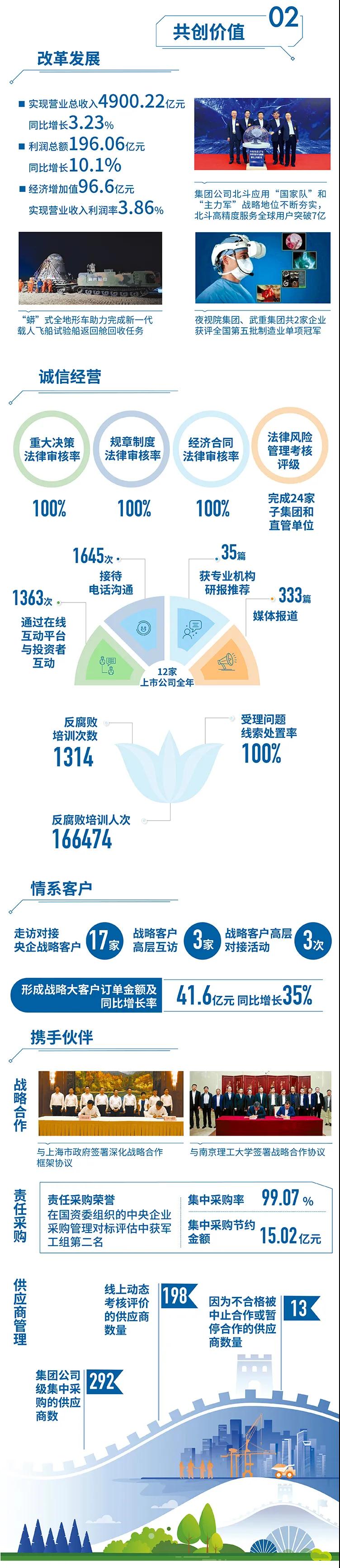 近日,國務(wù)院國資委在京舉辦“責(zé)任創(chuàng)造價值,責(zé)任引領(lǐng)未來——中央企業(yè)社會責(zé)任報告集中發(fā)布活動(2021)”,來自中央企業(yè)的92份《報告》向公眾全面展示央企認真履行社會責(zé)任的成果。兵器工業(yè)集團參加集中發(fā)布活動,并向社會公眾正式發(fā)布第十二份年度社會責(zé)任報告——《中國兵器工業(yè)集團有限公司2020年社會責(zé)任報告》,全面披露2020年度集團公司履責(zé)實踐和履責(zé)成效。會上發(fā)布了《中央企業(yè)社會責(zé)任藍皮書(2021)》,《中國兵器工業(yè)集團有限公司:內(nèi)化于心外化于行,打造央企責(zé)任管理表率》成功入選典型案例。 2020年,是“十三五”規(guī)劃收官之年,也是全面建成小康社會、實現(xiàn)第一個百年目標的決勝之年。集團公司黨組書記、董事長焦開河在報告開篇指出,集團公司實現(xiàn)了“十三五”圓滿收官,整體步入了高質(zhì)量發(fā)展軌道,呈現(xiàn)出基礎(chǔ)更牢、動力更強、空間更大、效能更高的積極向上良好態(tài)勢。在“十三五”特別是近三年來的工作實踐中,我們明確了“集團公司是國家安全和國防建設(shè)的脊梁、是國家戰(zhàn)略科技力量最為重要的組成部分、是黨和國家最可信賴的‘六個力量’,肩負著支撐國防軍隊建設(shè)、推動科技自立自強、服務(wù)構(gòu)建新發(fā)展格局的重大政治責(zé)任和光榮使命,具有極強的政治屬性,性質(zhì)特殊、使命特殊、責(zé)任特殊”的新時代新階段職責(zé)使命,深化了對“堅持以習(xí)近平新時代中國特色社會主義思想定向領(lǐng)航,是集團公司高質(zhì)量發(fā)展的根本遵循;保持貫徹落實習(xí)近平總書記重要指示批示和黨中央決策部署的戰(zhàn)略定力,是集團公司高質(zhì)量發(fā)展的根本前提;履行好強軍這個首要職責(zé),是集團公司高質(zhì)量發(fā)展的根本要求;加快兵器科技創(chuàng)新突破,是集團公司高質(zhì)量發(fā)展的根本支撐;加強黨的領(lǐng)導(dǎo)黨的建設(shè),是集團公司高質(zhì)量發(fā)展的根本保證”的兵器工業(yè)改革發(fā)展規(guī)律認識。 《報告》聚焦“抗疫斗爭中的‘兵器力量’”,生動展示了集團公司抗擊疫情的有力行動,展現(xiàn)了集中力量辦大事、急國家之所急的“兵器速度”,彰顯了“把一切獻給黨”的人民兵工精神和貫徹落實國家決策部署的責(zé)任擔(dān)當(dāng)?!秷蟾妗芬浴坝眯氖睾蚝推?、用情溫暖社會”為主題,從恪守本責(zé)、共創(chuàng)價值、致力和諧、踐行綠色、責(zé)任管理五個維度,全面展現(xiàn)集團公司在堅持履行政治責(zé)任、經(jīng)濟責(zé)任、社會責(zé)任,履行強軍首責(zé)、加強黨的建設(shè)、打造國家戰(zhàn)略科技力量、推進“一帶一路”倡議、打好打贏三大攻堅戰(zhàn)、深化改革、助力員工成長、支持社會公益事業(yè)、提升社會責(zé)任管理等方面的生動實踐和履責(zé)亮點,凸顯集團公司保持貫徹落實黨中央決策部署的戰(zhàn)略定力、在聚焦主責(zé)主業(yè)、科技引領(lǐng)、國際化經(jīng)營上持續(xù)用力,為實現(xiàn)第一個百年奮斗目標貢獻力量的初心與行動。《報告》再次獲得中國企業(yè)社會責(zé)任報告評級專家委員會“五星佳”最高評級,兵器工業(yè)集團成為軍工行業(yè)唯一連續(xù)10年獲得最高評級的企業(yè)。 2021年是開啟新征程的開局之年,也是建黨100周年、人民兵工創(chuàng)建90周年,兵器工業(yè)集團將全面貫徹落實黨中央戰(zhàn)略部署,緊扣推動高質(zhì)量發(fā)展主題,圍繞“十四五”開好局、起好步,堅決完成黨中央賦予的職責(zé)使命,履行好中央企業(yè)和軍工集團的政治責(zé)任、經(jīng)濟責(zé)任、社會責(zé)任,為實現(xiàn)中國夢強軍夢作出新的更大貢獻! 一圖看懂《中國兵器工業(yè)集團有限公司2020年社會責(zé)任報告》 |