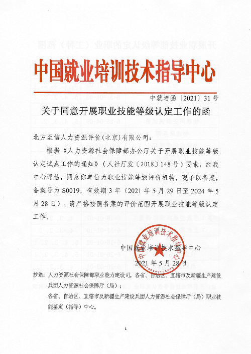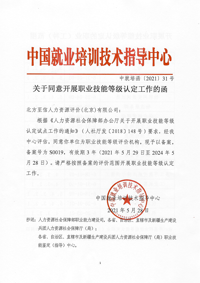 5月28日,人力資源社會保障部中國就業(yè)培訓技術指導中心發(fā)布了《關于同意開展職業(yè)技能等級認定工作的函》(中就培函〔2021〕31號),北方至信人力資源評價(北京)有限公司(以下簡稱“北方至信”)成為首家央企全國性社會培訓評價組織職業(yè)技能等級認定機構。