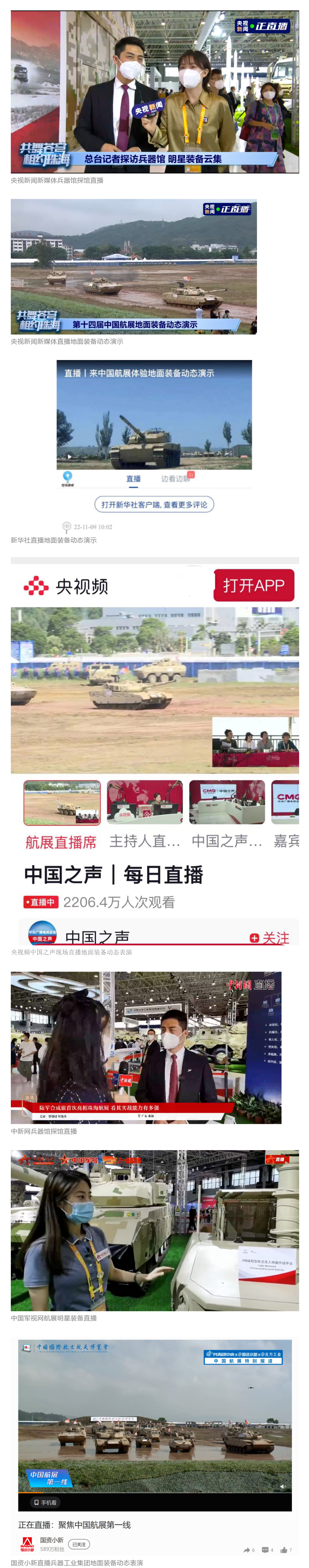 央視新聞新媒體、央視頻中國(guó)之聲、新華社、中國(guó)新聞網(wǎng)、中國(guó)軍視網(wǎng)、CGTN(微博、臉書、推特)等媒體以及國(guó)資小新、共青團(tuán)中央、鳳凰軍事等到兵器工業(yè)集團(tuán)地面動(dòng)態(tài)演示區(qū)、中國(guó)兵器館進(jìn)行了直播。航展期間,集團(tuán)公司微信視頻號(hào)、微博、抖音號(hào)、快手號(hào)共進(jìn)行8次直播,最高觀看人數(shù)突破24萬(wàn)。