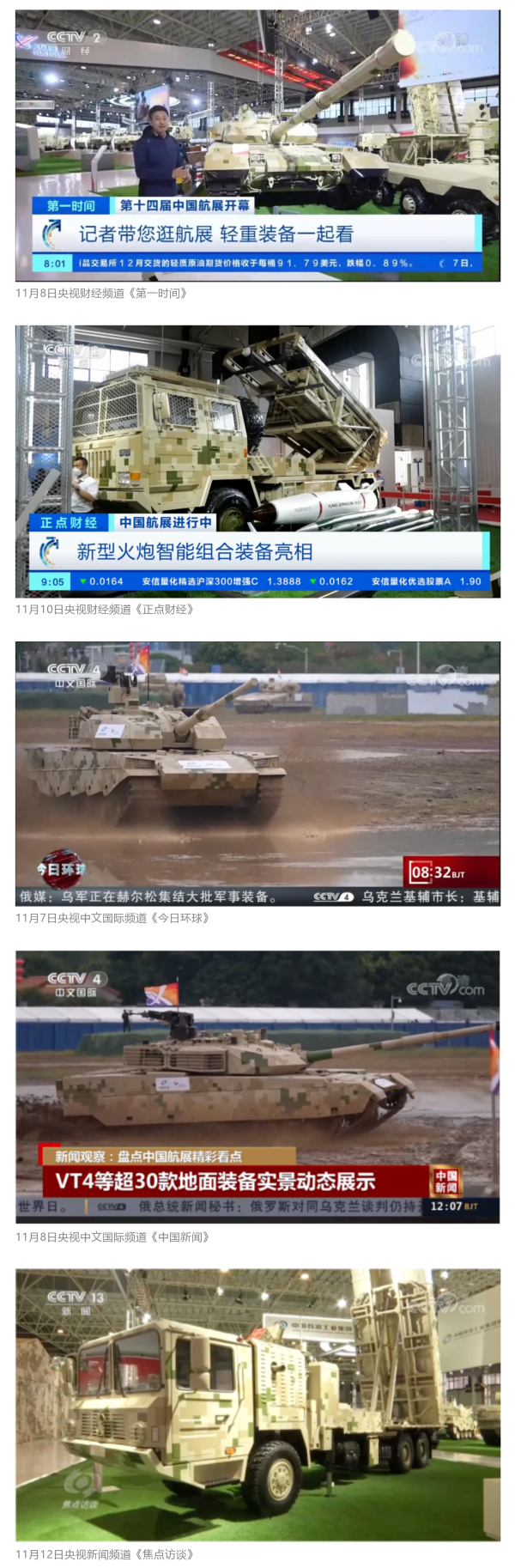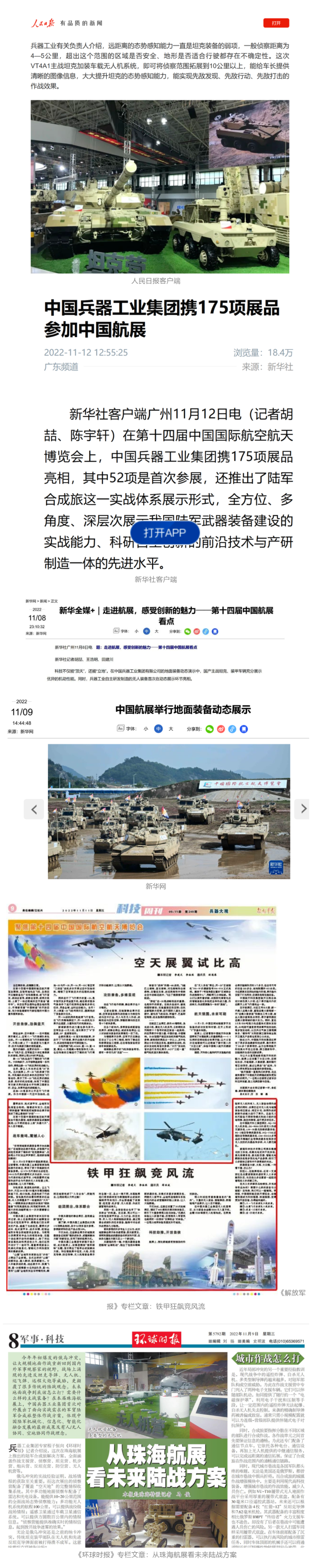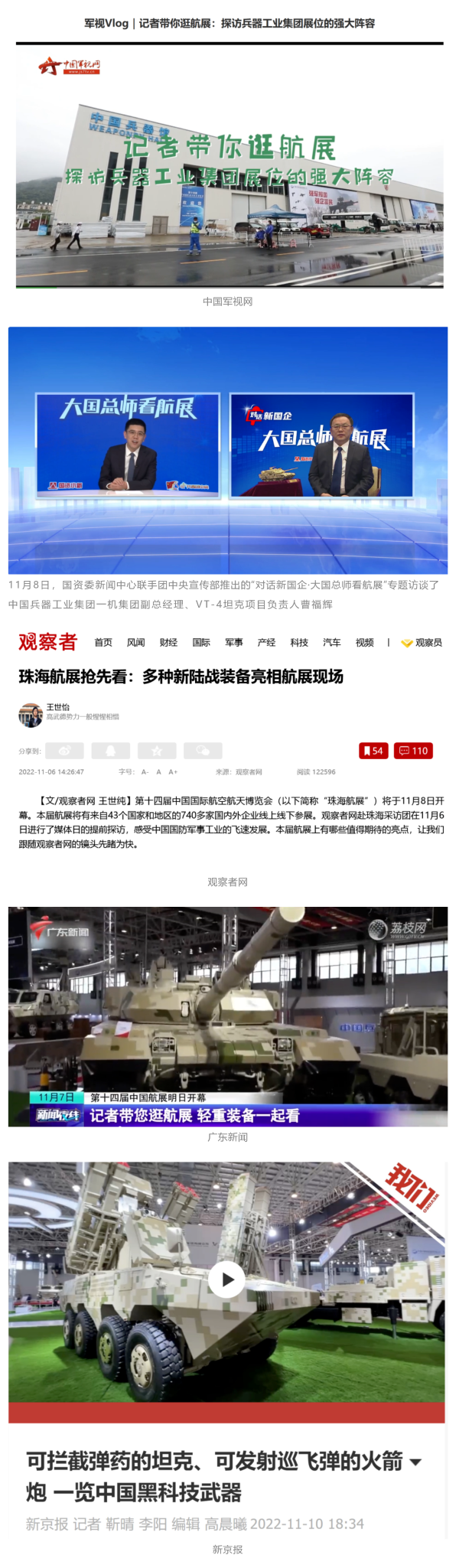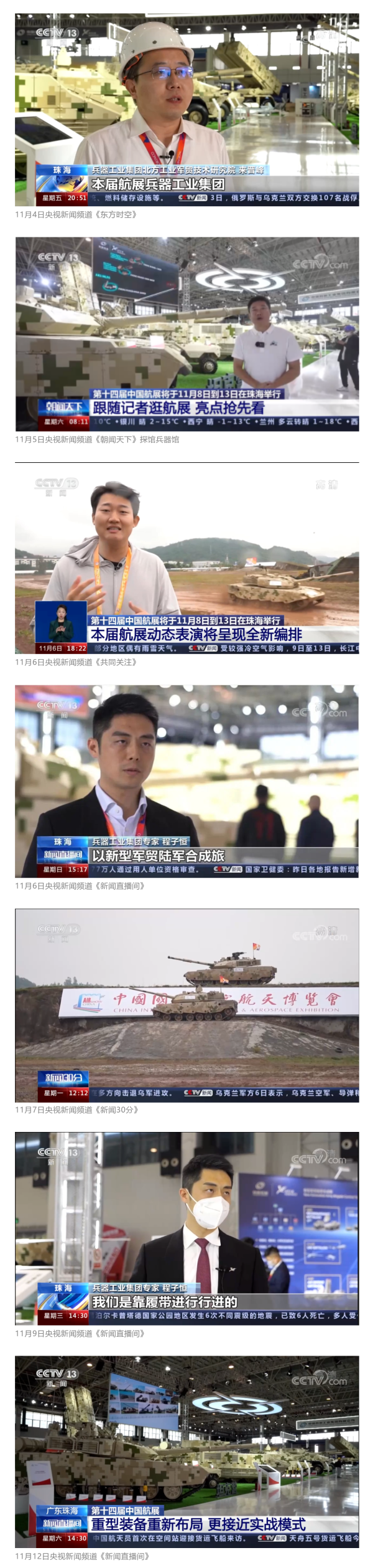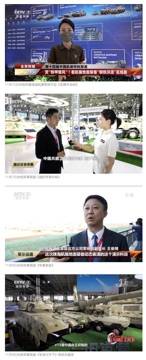 央視國(guó)防軍事頻道航展特別報(bào)道《炫舞天地間》11月12日《賞“鐵甲雄風(fēng)”!看航展地面裝備“鋼鐵洪流”名場(chǎng)面》對(duì)兵器工業(yè)集團(tuán)武器裝備特色亮點(diǎn)進(jìn)行報(bào)道。《國(guó)防軍事早報(bào)》11月7日推出報(bào)道《第十四屆中國(guó)國(guó)際航空航天博覽會(huì)明天開幕 中國(guó)兵器館首次以陸軍合成旅實(shí)戰(zhàn)體系形式展出》,對(duì)兵器館陸軍合成旅實(shí)戰(zhàn)體系進(jìn)行報(bào)道?!盾娛聢?bào)道》11月9日推出《第十四屆中國(guó)國(guó)際航空航天博覽會(huì) 地面兵器裝備首次聯(lián)合陸航直升機(jī)進(jìn)行動(dòng)態(tài)展示》報(bào)道。《軍迷行天下》11月9日推出報(bào)道《軍迷打卡航展2022》以專業(yè)軍迷視角探館兵器館,全面展示兵器工業(yè)集團(tuán)參展裝備特色亮點(diǎn)。