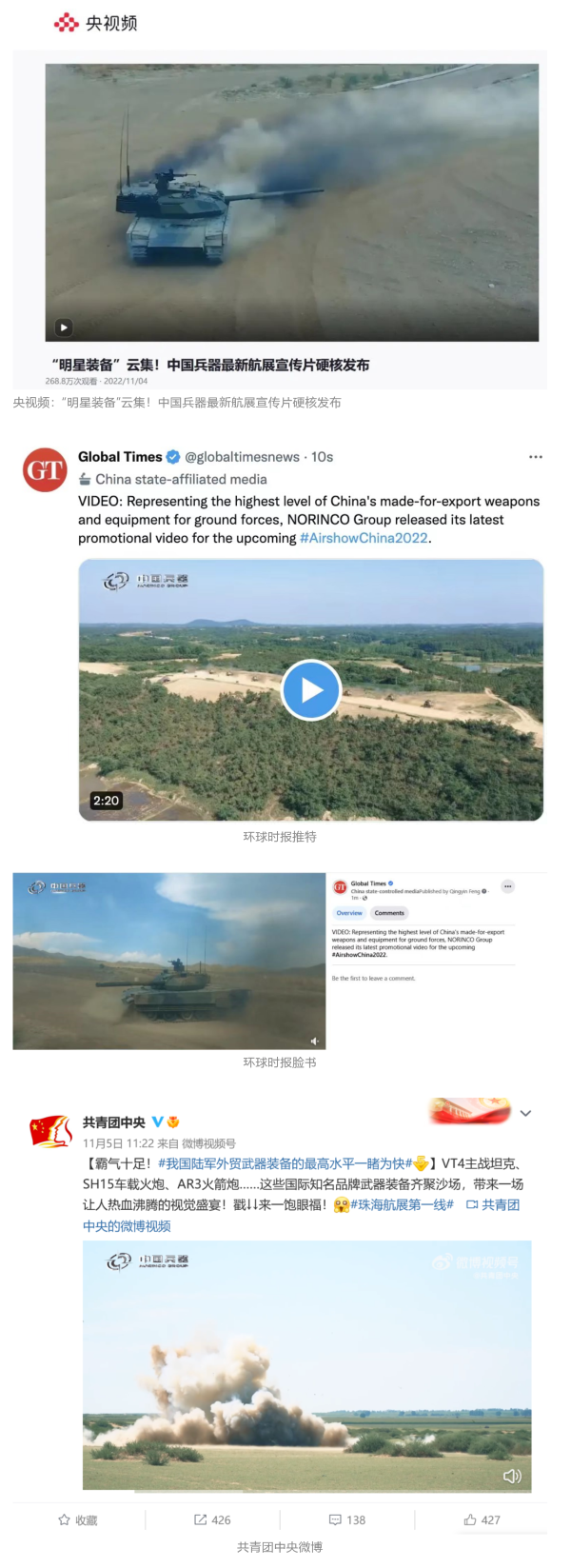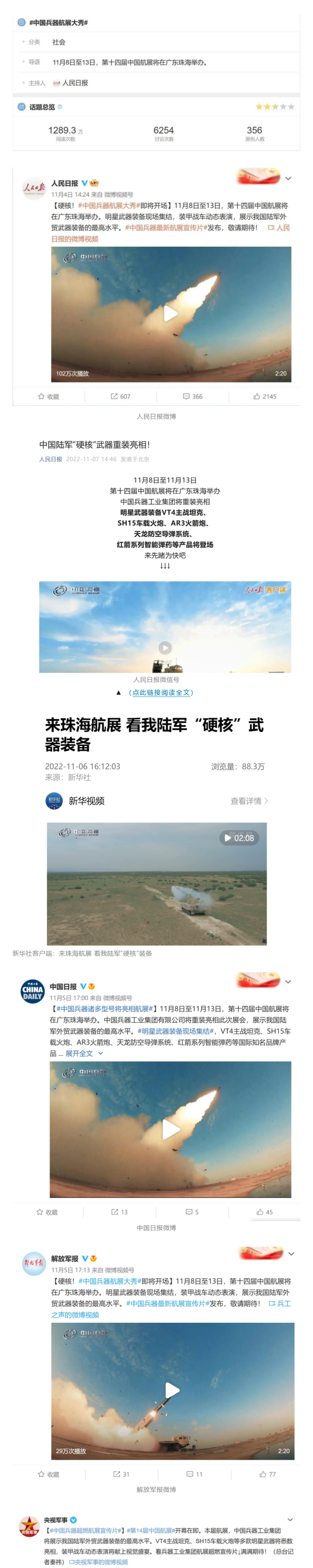 人民日?qǐng)?bào)官方微博、微信公眾號(hào),新華社客戶端、央視新聞客戶端、中國(guó)日?qǐng)?bào)微博、參考消息微信公眾號(hào)、解放軍報(bào)微博、央視軍事微博、CGTN微博、中國(guó)軍號(hào)微博、共青團(tuán)中央微博、環(huán)球時(shí)報(bào)(英文網(wǎng)站、臉書賬號(hào)、推特賬號(hào))、嗶哩嗶哩、學(xué)習(xí)強(qiáng)國(guó)平臺(tái)、國(guó)資小新視頻號(hào)、網(wǎng)易軍事、騰訊軍事、鳳凰軍事、北京日?qǐng)?bào)、東方衛(wèi)視看看新聞全媒體、北京電視臺(tái)等20余家中央主流媒體、國(guó)家部委、省市媒體的新媒體第一時(shí)間播發(fā)集團(tuán)公司航展宣傳片等視頻作品燃爆全網(wǎng),累計(jì)閱讀量突破1700萬(wàn)人次。集團(tuán)公司微信公眾號(hào)、微博、抖音號(hào)、快手號(hào)、微信視頻號(hào)、知乎號(hào)等新媒體宣傳片播放閱讀量超過(guò)800萬(wàn)人次,點(diǎn)贊超過(guò)30萬(wàn)人次。集團(tuán)公司微信公眾號(hào)推出《硬核!中國(guó)兵器最新航展宣傳片發(fā)布》《中國(guó)兵器航展節(jié)目單,請(qǐng)選出心中明星裝備》《航展首日,中國(guó)兵器閃耀亮相!》等7篇報(bào)道,閱讀量超過(guò)25萬(wàn)人次,集團(tuán)公司微信視頻號(hào)、抖音號(hào)、快手號(hào)等新媒體賬號(hào)發(fā)布“中國(guó)兵器航展大秀”系列視頻,觀看量超過(guò)330萬(wàn)人次。