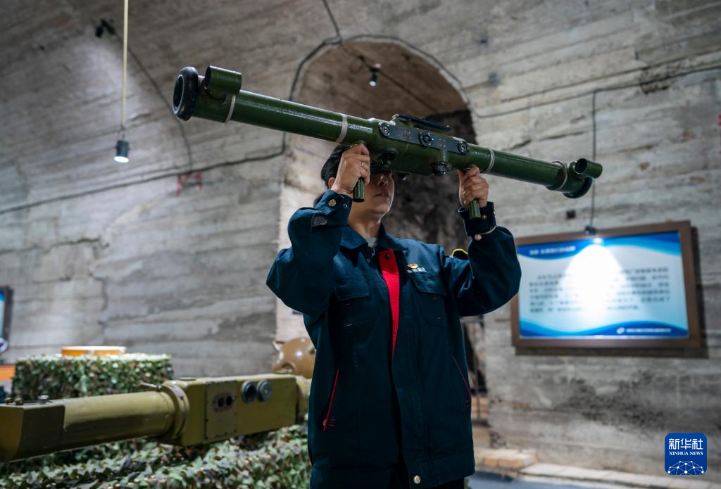 5月16日,一名工作人員在中國光學(xué)歷史博物館內(nèi)展示對空測距機使用方法。
