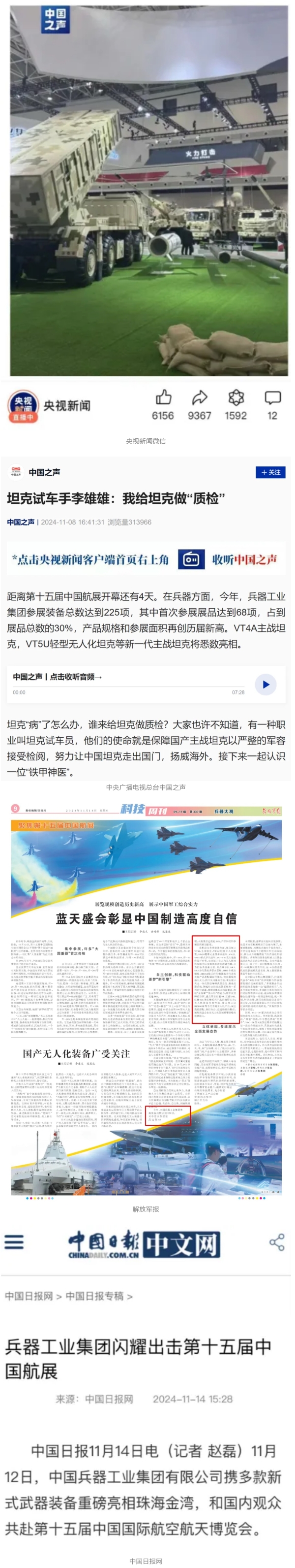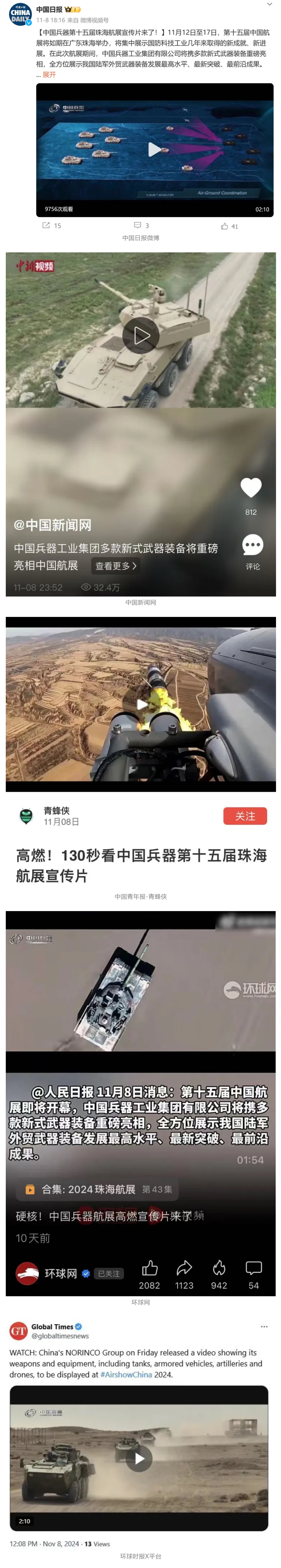 新華社、央視新聞、中央廣播電視總臺中國之聲、央視軍事、中國軍視網(wǎng)、廣東廣播電視臺等媒體以及國家國防科工局、國資小新等到兵器工業(yè)集團地面動態(tài)演示區(qū)、中國兵器館進行了直播。