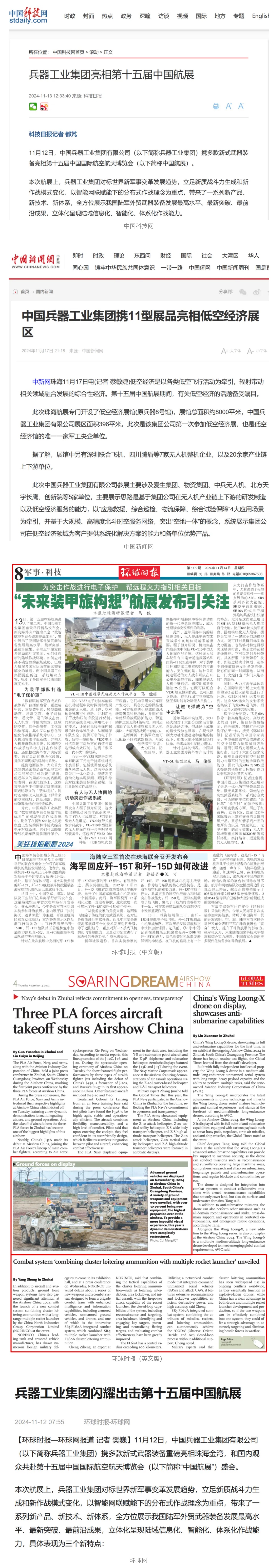 11月13日央視新聞《藍天之約》直播地面裝備動態(tài)演示此次航展,央視綜合頻道《新聞聯(lián)播》《晚間新聞》、新聞頻道《新聞直播間》《新聞30分》《朝聞天下》《共同關(guān)注》《東方時空》《午夜新聞》、財經(jīng)頻道《天下財經(jīng)》《經(jīng)濟信息聯(lián)播》《正點財經(jīng)》《第一時間》、中文國際頻道《今日環(huán)球》《中國新聞》、國防軍事頻道《軍事報道》《正午國防軍事》《國防軍事早報》《軍迷行天下》等欄目共播出兵器工業(yè)集團參展相關(guān)新聞報道40余條。11月10日央視新聞頻道《新聞30分》11月10日央視中文國際頻道《中國新聞》11月10日央視國防軍事頻道《軍事報道》11月11日央視國防軍事頻道《正午國防軍事》